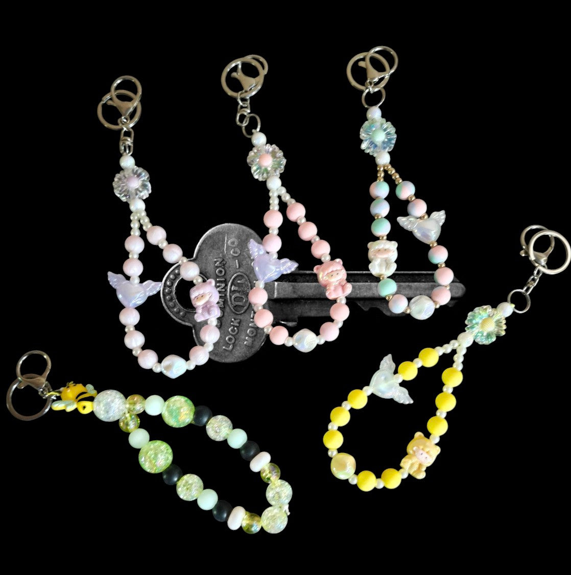 Deze handgemaakte sleutel-/handtashanger is een echte eyecatcher! Met zachte pastelkleuren, glanzende kralen en schattige details zoals een beertje, een vogel en een bloem straalt deze hanger pure vrolijkheid uit. De hanger is perfect voor aan je sleutelbos, handtas of rugzak en geeft direct een persoonlijke, speelse touch.