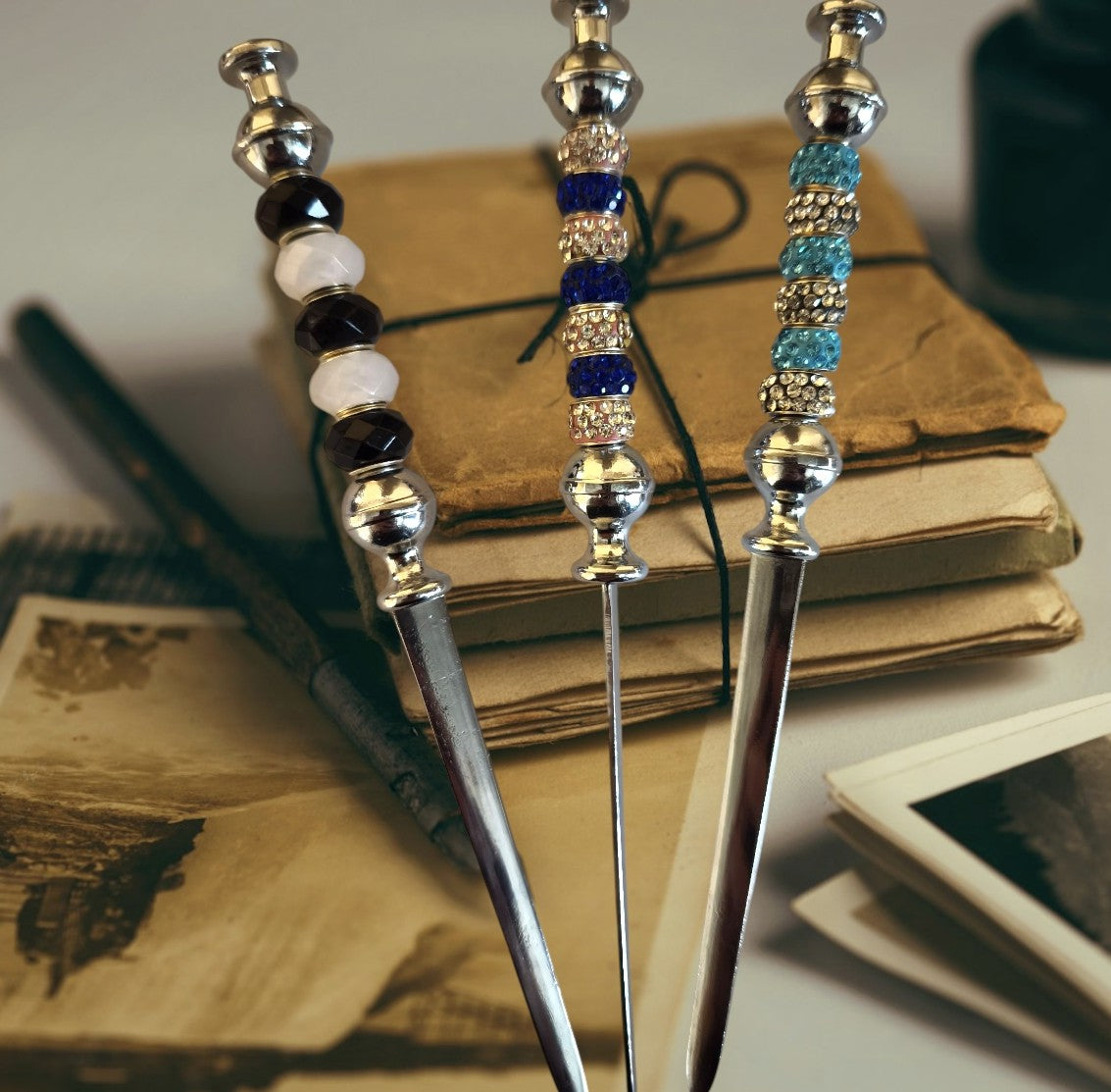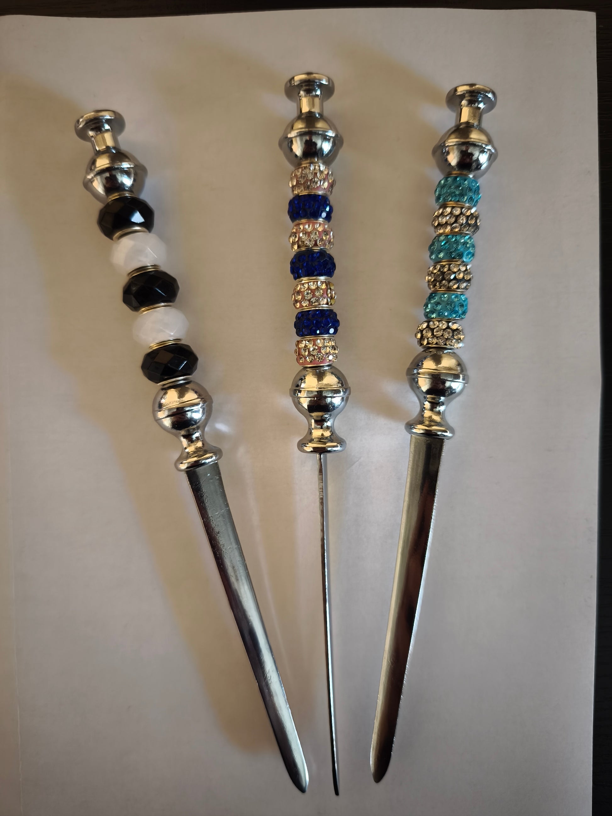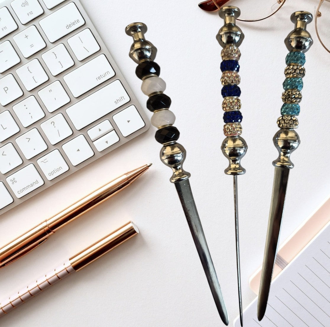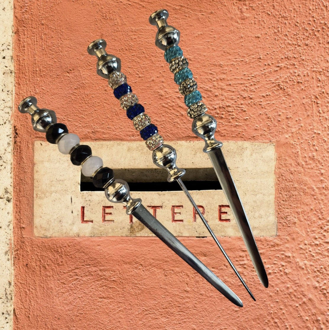 Onze handgemaakte brievenopeners zijn niet alleen praktisch, maar ook een lust voor het oog. Elk stuk is uniek, afgewerkt met glanzende kralen en stijlvolle details – een elegant accessoire voor op elk bureau.